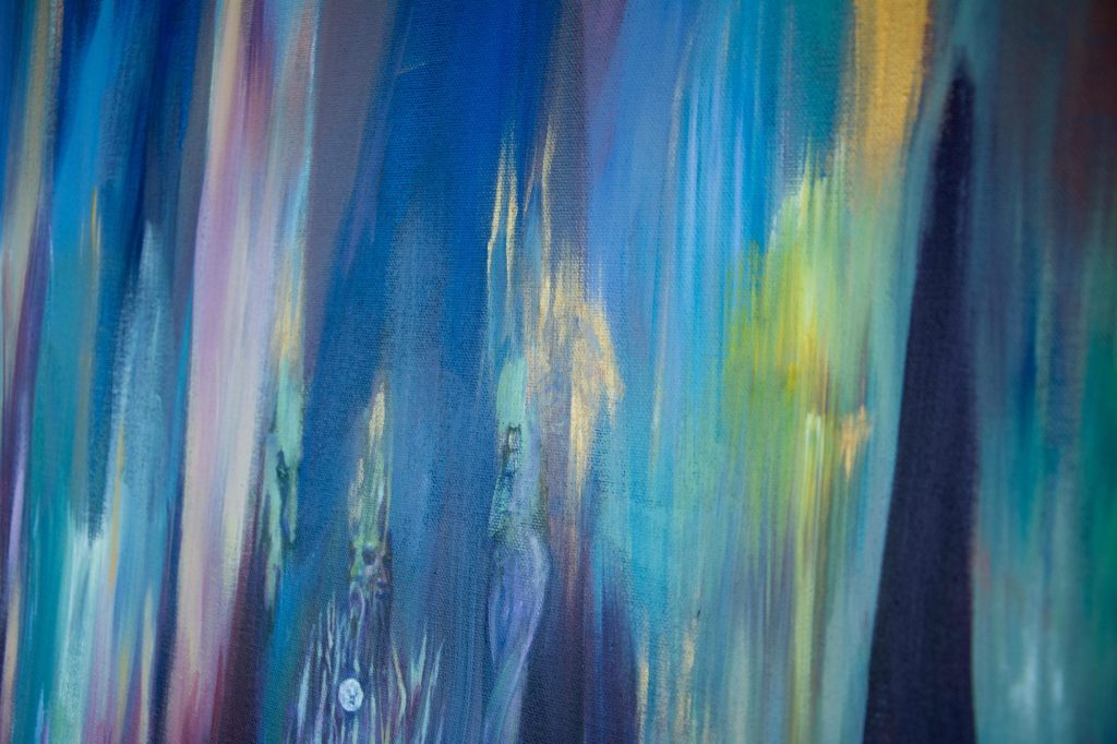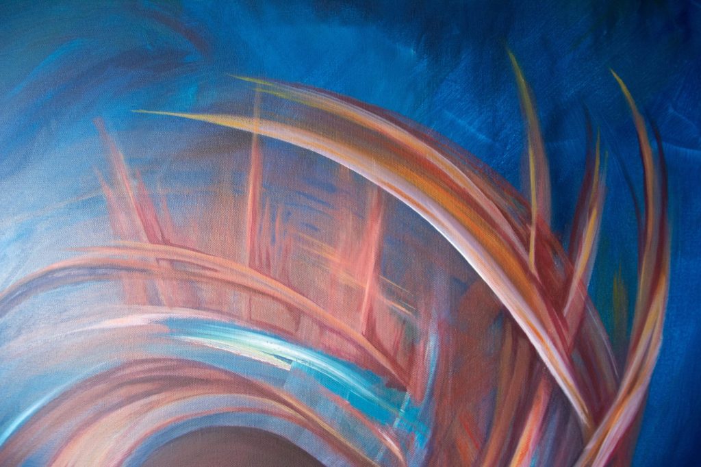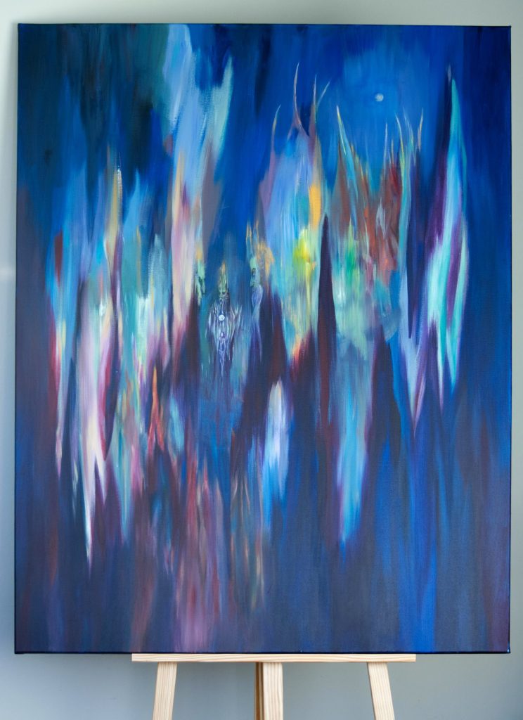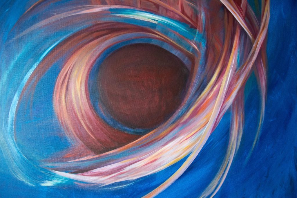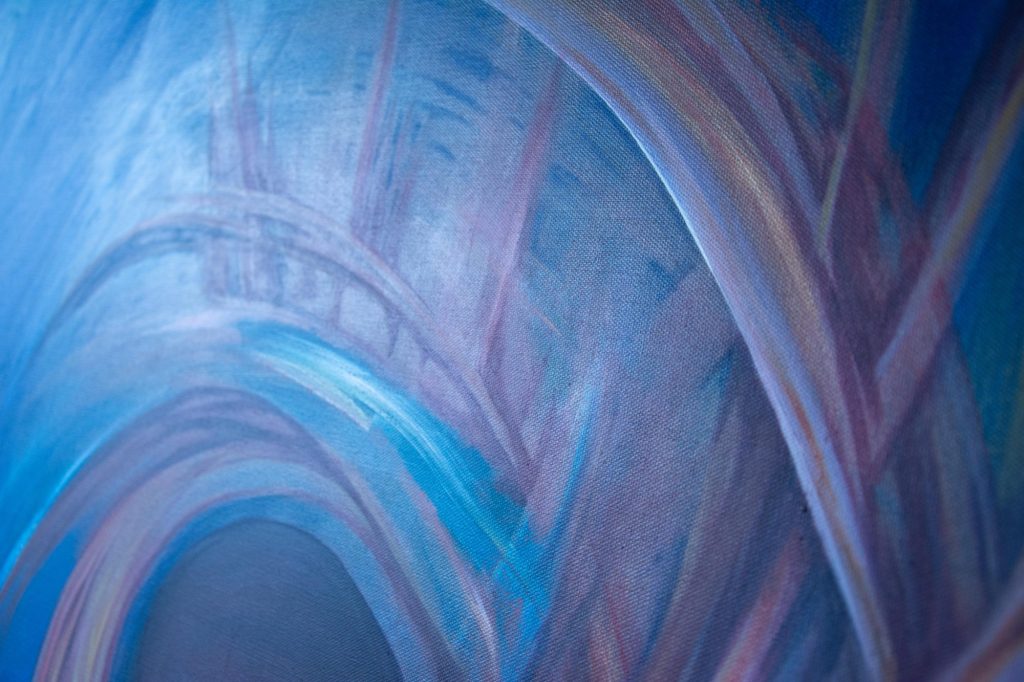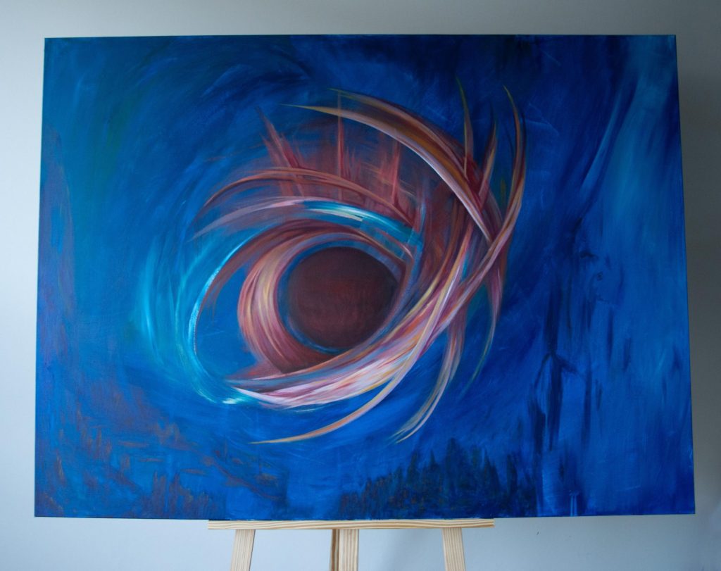 My Bestefar (Grandpa) who worked for NASA described this piece best: ” A swirly, swooshing, space thingy”. That’s the vision that came to mind and that’s what I put down. I like to think of it as placed above a village, which is hinted at in the blues below and in turn acts as some form of link between worlds. Though, other days I see it as something much more vast and volatile, and others I see an intricate balance of energy and potential.