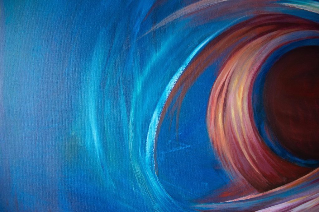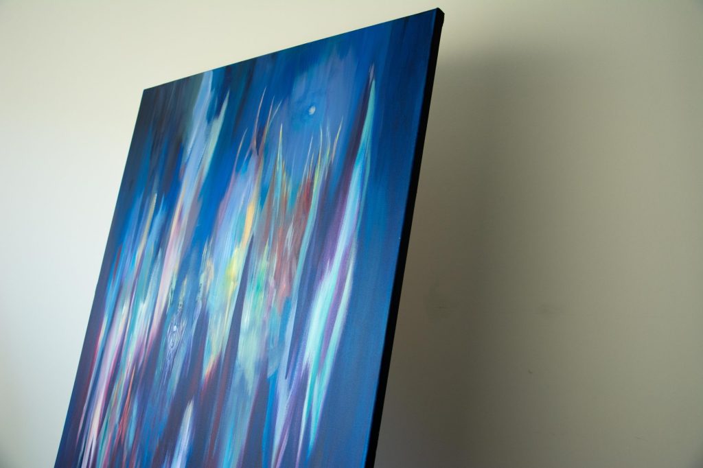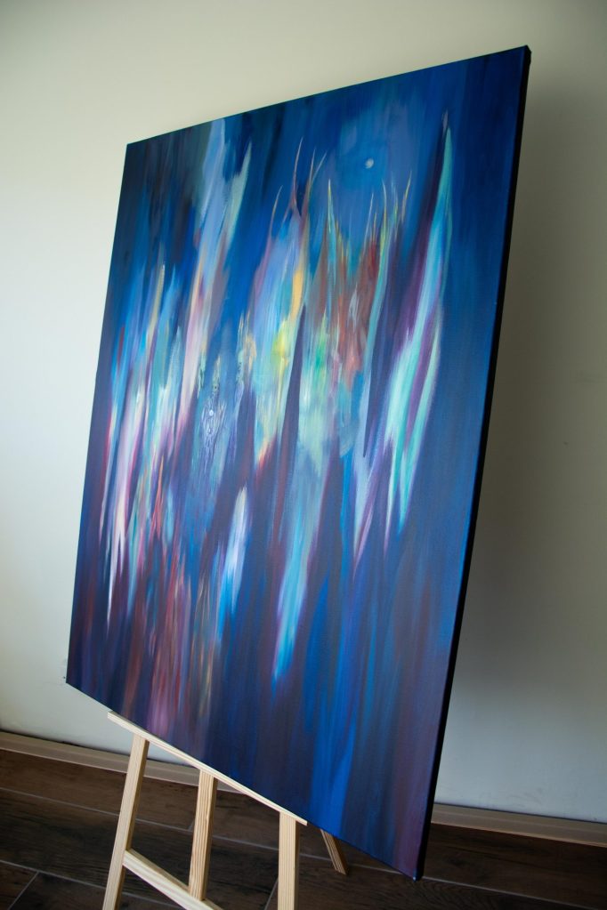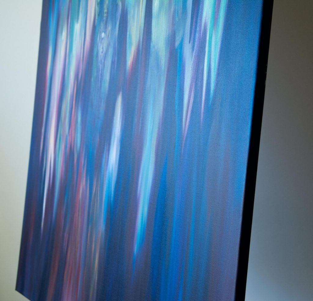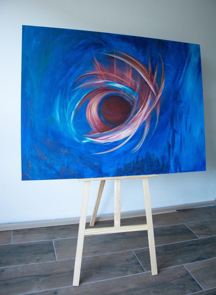My Bestefar (Grandpa) who worked for NASA described this piece best: ” A swirly, swooshing, space thingy”. That’s the vision that came to mind and that’s what I put down. I like to think of it as placed above a village, which is hinted at in the blues below and in turn acts as some form of link between worlds. Though, other days I see it as something much more vast and volatile, and others I see an intricate balance of energy and potential.