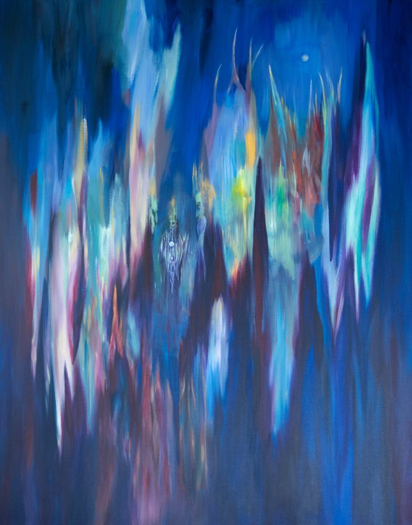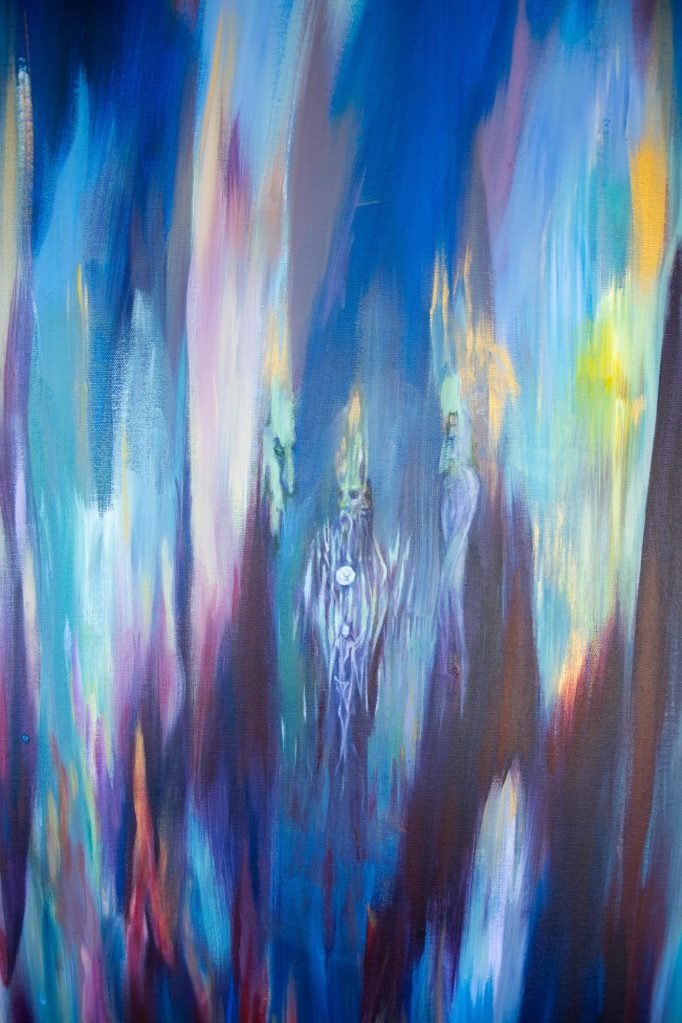 These paintings were intuitive and meditative. Rift was painted to envision the idea of how stars affect us and our beliefs and what we feel connected too. It is also connected to the loss of a friend who took his life and the conflict in my mind of where he would go depending on which religion and spiritual path you looked to. The left face from the centre has his colours ebb downwards, the figure on the right has theirs stretching up and the centre shows a being illuminated amongst trees, standing under the same moon that they do. Gold and rust hues bring a further ethereal quality to the piece.